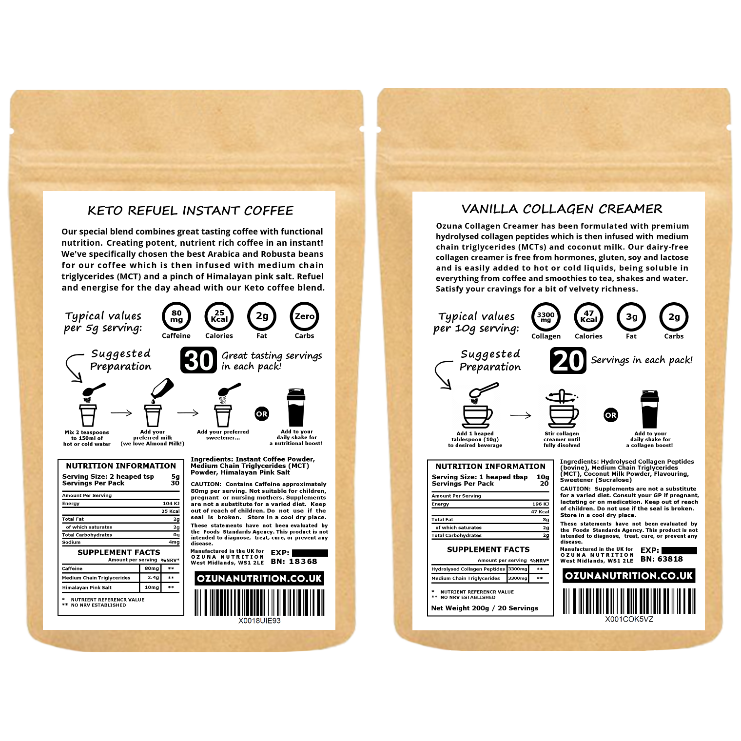 Refuel and energise for the day ahead with our delicious Instant Keto Coffee and Vanilla Collagen Creamer bundle. The perfect addition to your Keto, low Carb or weight loss regimen.