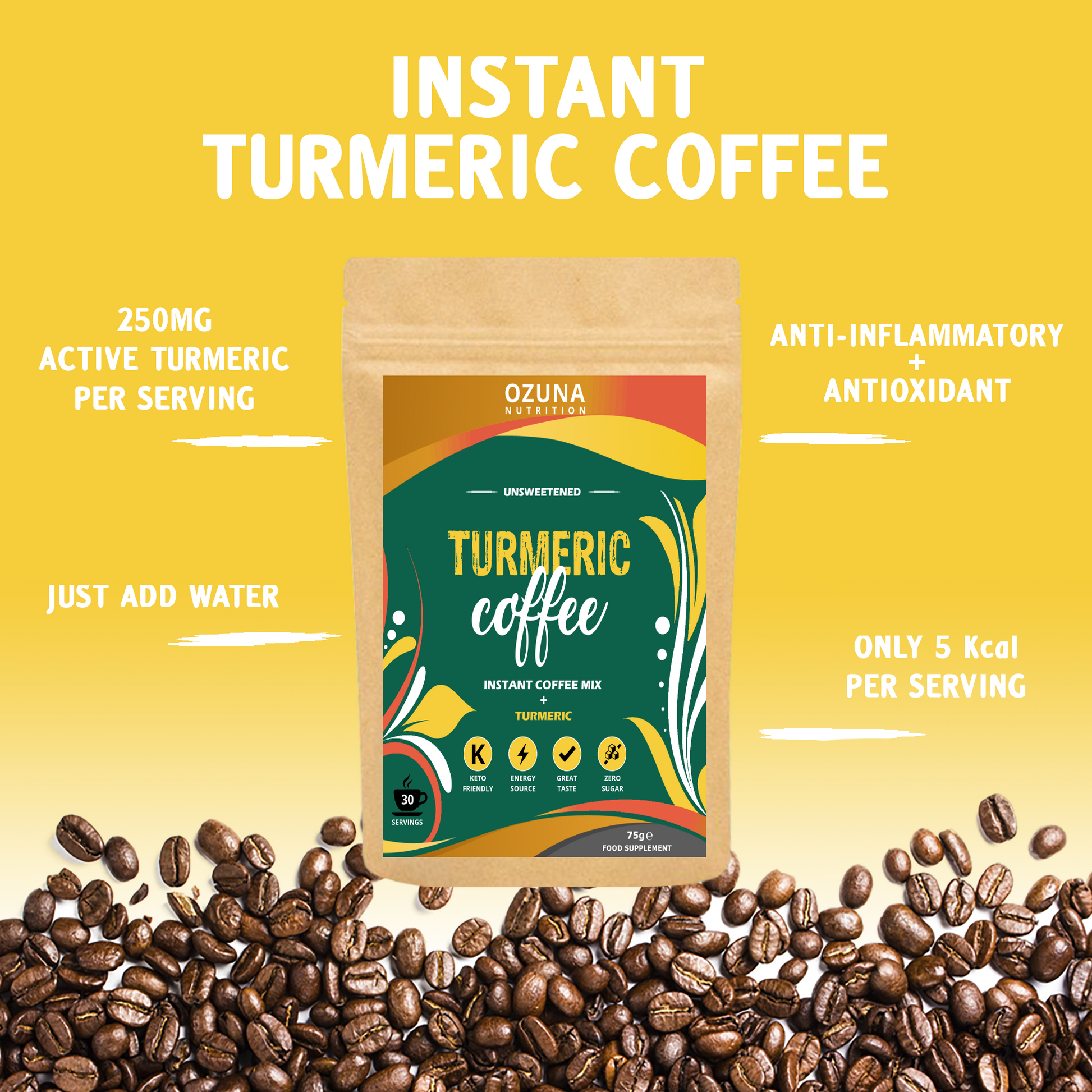 Our Turmeric Coffee is very low in calories with only 5 Kcal per serving and zero sugar. The perfect addition to any low carb, paleo or ketogenic diet. Our instant turmeric coffee can be mixed hot or cold, no need to brew or filter!