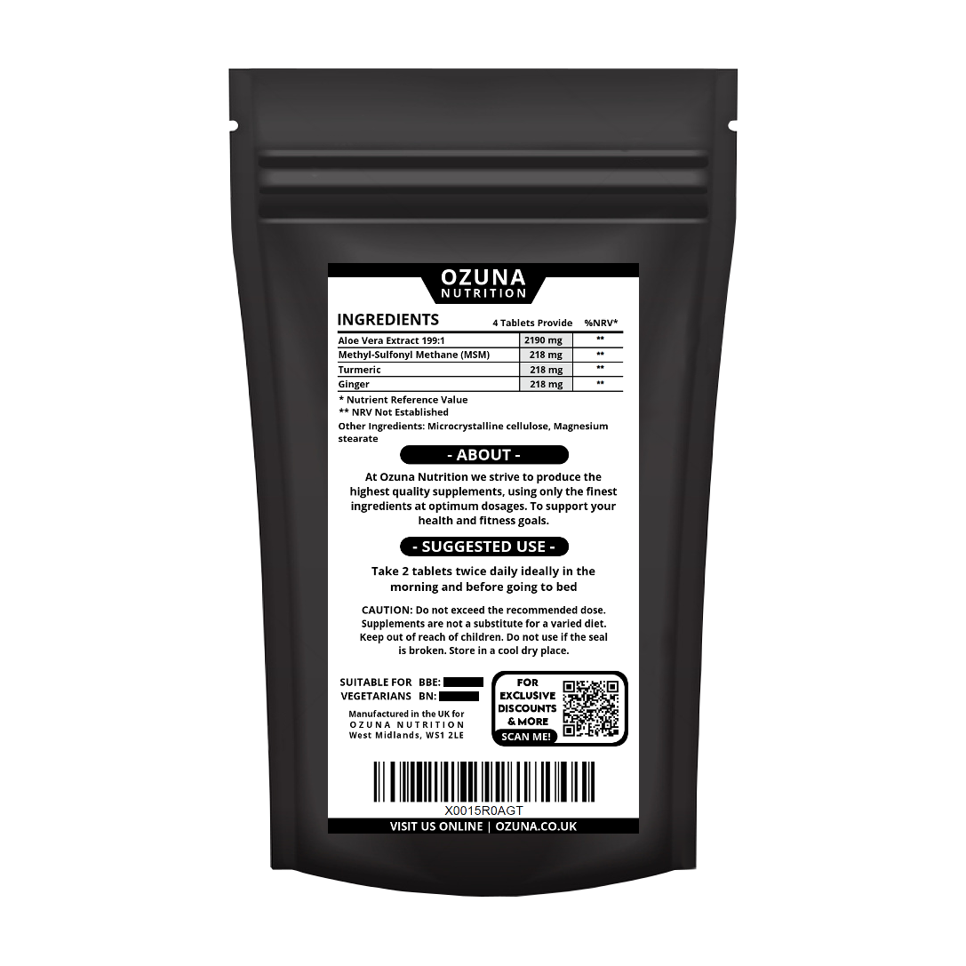 Aloe Vera Extract 199:1, MSM, Turmeric, Ginger, Microcrystalline Cellulose, Magnesium Stearate