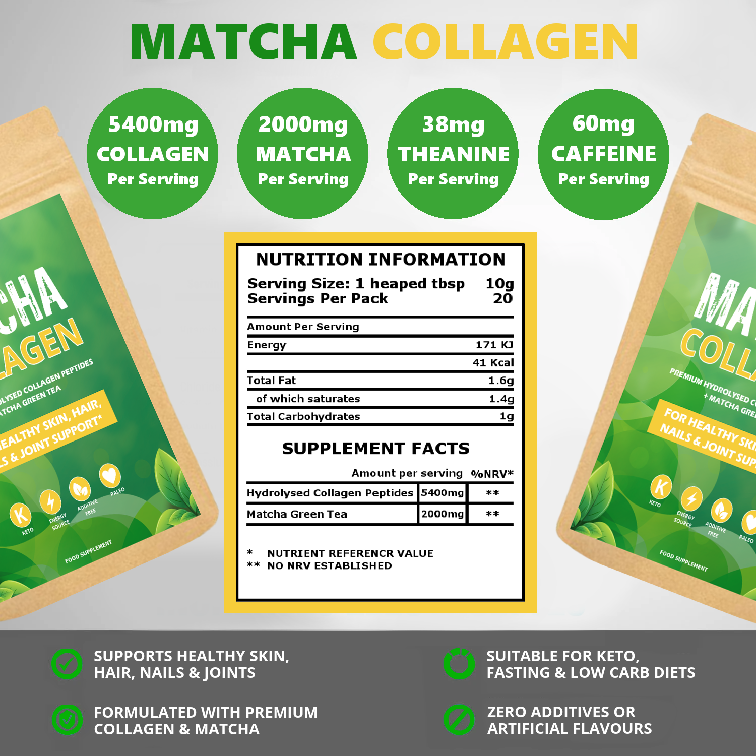 - COLLAGEN SUPPORT: Each delicious serving of our Matcha Collagen contains a huge 5400mg of premium collagen peptides protecting and vitalizing skin, hair and nails.