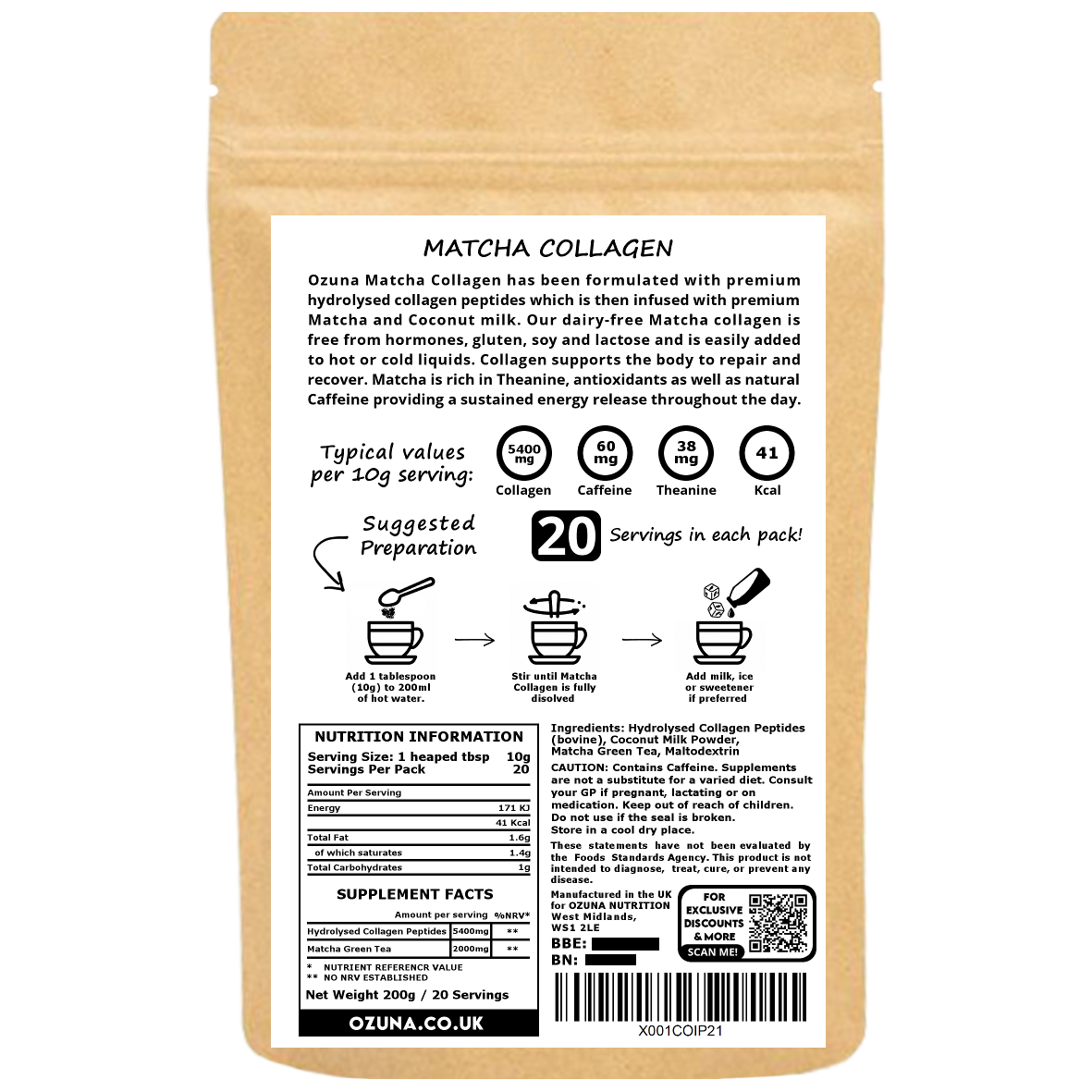 Hydrolysed Collagen Peptides (Bovine), Coconut Milk Powder, Matcha Green Tea