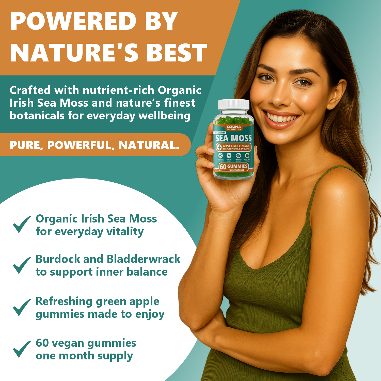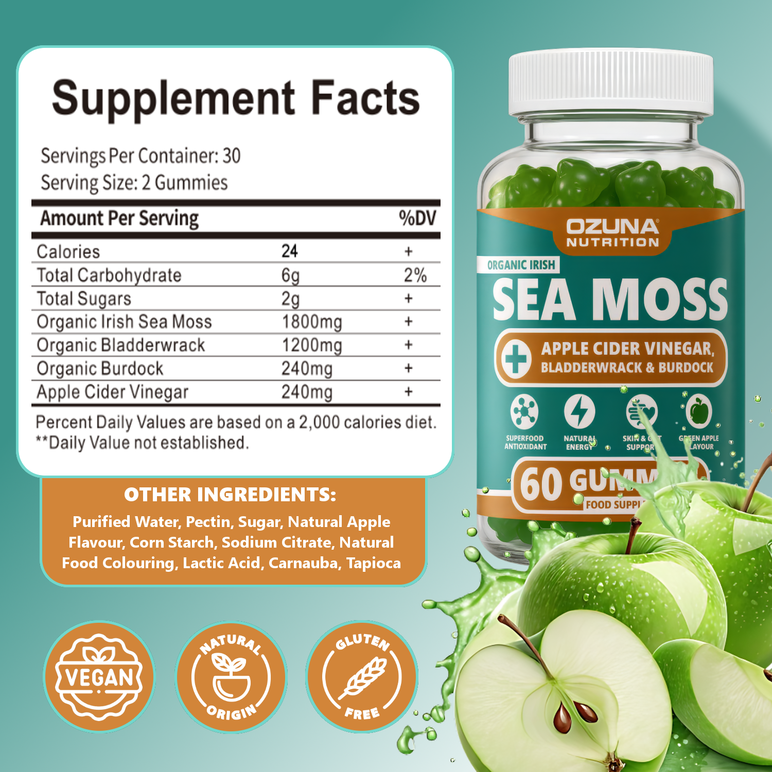 Our Sea Moss Gummies combine organic Irish Sea Moss, Bladderwrack, Burdock and Apple Cider Vinegar to support digestion, skin, and daily energy — a natural mineral boost in every delicious bite.