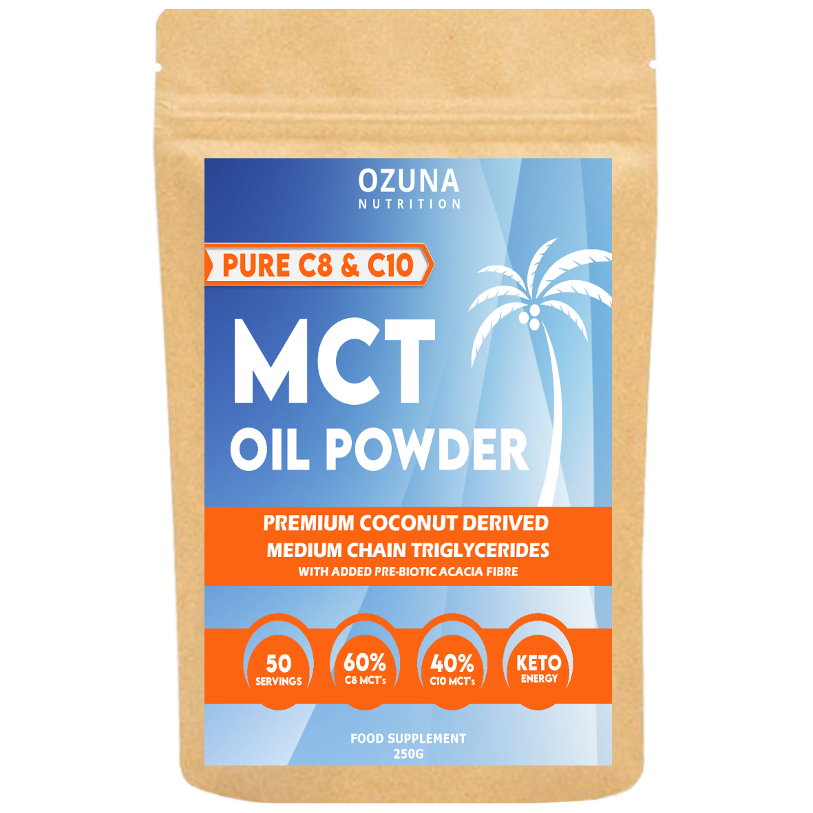 - C8 & C10 MCT’s: Ozuna MCT Oil Powder contains concentrated medium-chain triglycerides at the preferred ratio of 60% Caprylic acid (C8) and 40% Capric acid (C10) with added prebiotic Acacia fiber for gut health.