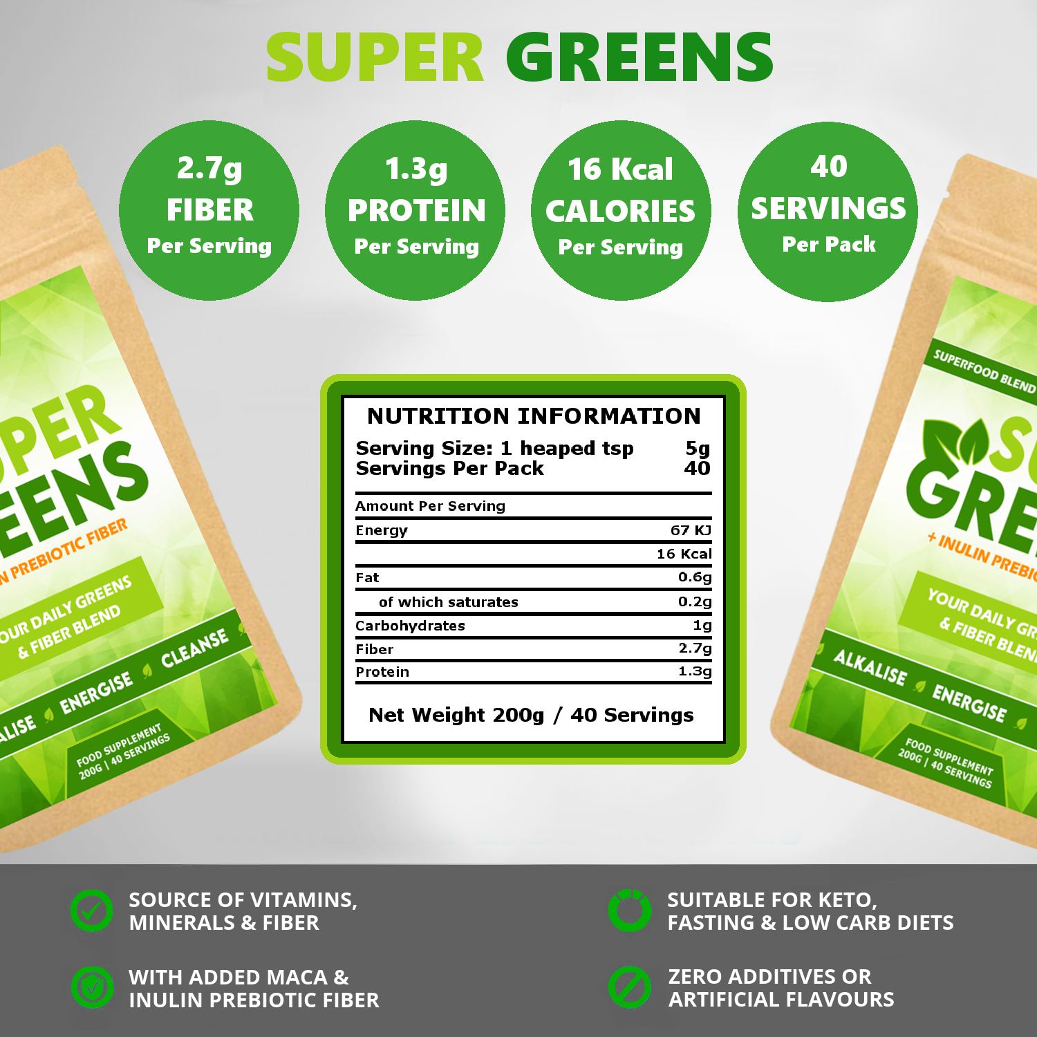 superfoods including Maca and Inulin Prebiotic Fiber. Made using only the highest quality ingredients, our Super Greens does not contain fillers, binders, preservatives or additives.